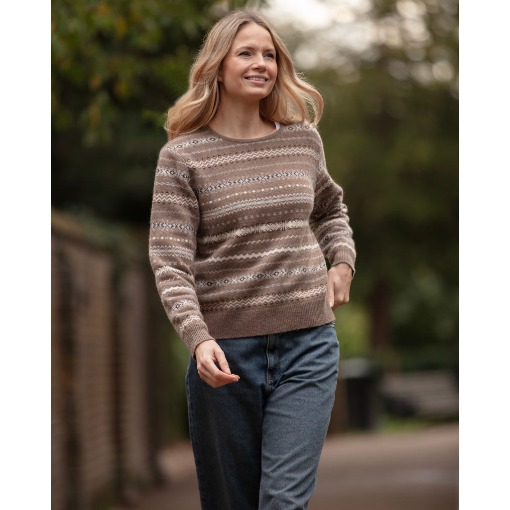 Made from quality Italian yarn, this chunky Cashmere and Merino Blend Crew neck offers both warmth and softness. With fashioned shoulders it can easily be worn under a coat. The design is inspired by traditional Shetland Island Fairisle patterns and comes in two lovely colour ways; Felt brown and a rich grass green reflecting the wonderful colours of the Scottish countryside. 85% Merino Wool 15% Cashmere.